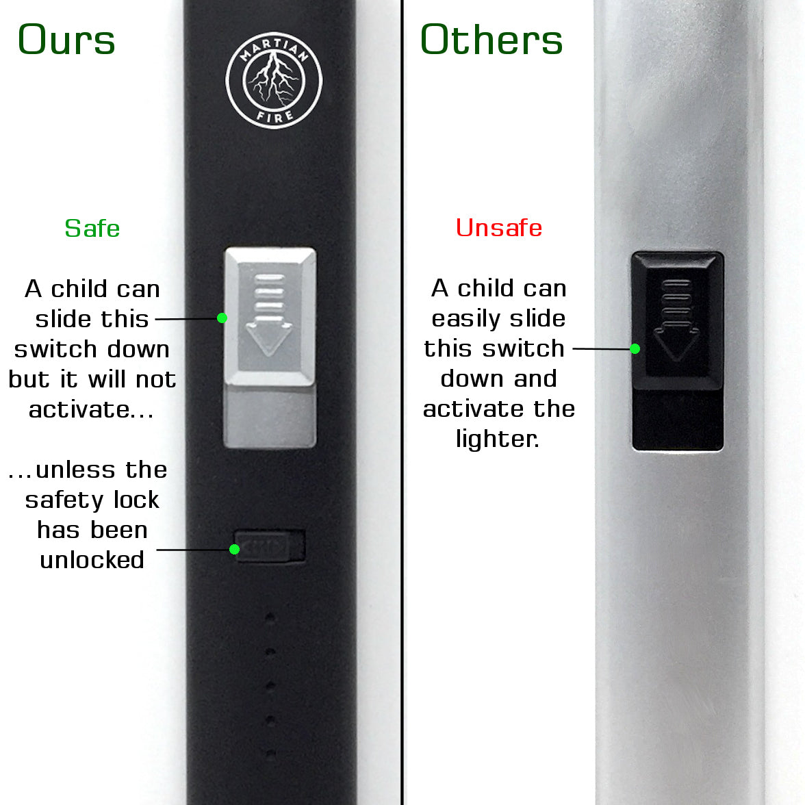 DOUBLE SAFETY LOCK FEATURE - twice as safe as all other lighters on the market. Other lighters have a weak safety system which can easily be used by children. OURS has a very secure double safety lock to ensure children can’t accidentally switch it on.